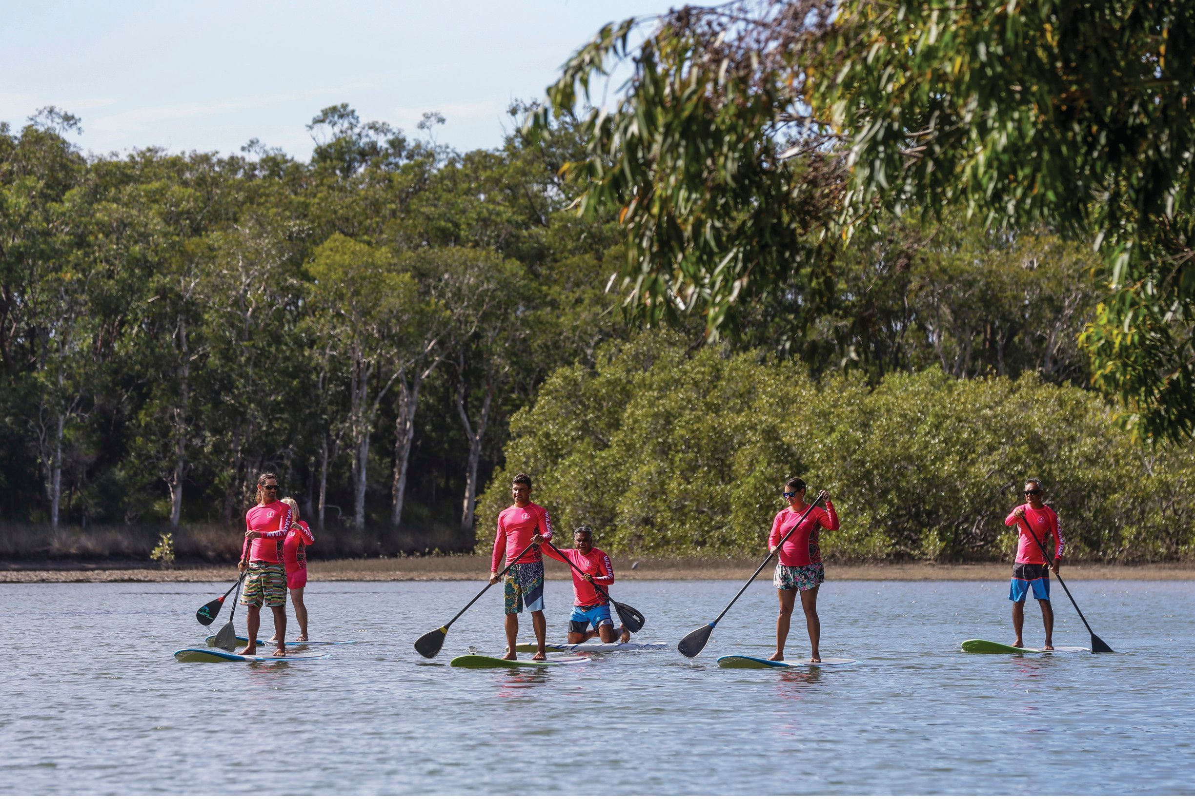 Wajaana Yaam Gumbaynggirr Adventure Tours (WYAT) is an award-winning Aboriginal-owned and -operated touring business in Coffs Harbour, located six hours’ drive or a one-hour flight north of Sydney. Aboriginal guides take guests stand-up paddling in the Solitary Islands Marine Park on a journey through the rich Gumbaynggirr culture to hear the local traditional dreaming stories, smell and taste the seasonal bush tucker and see the stunning landscape.